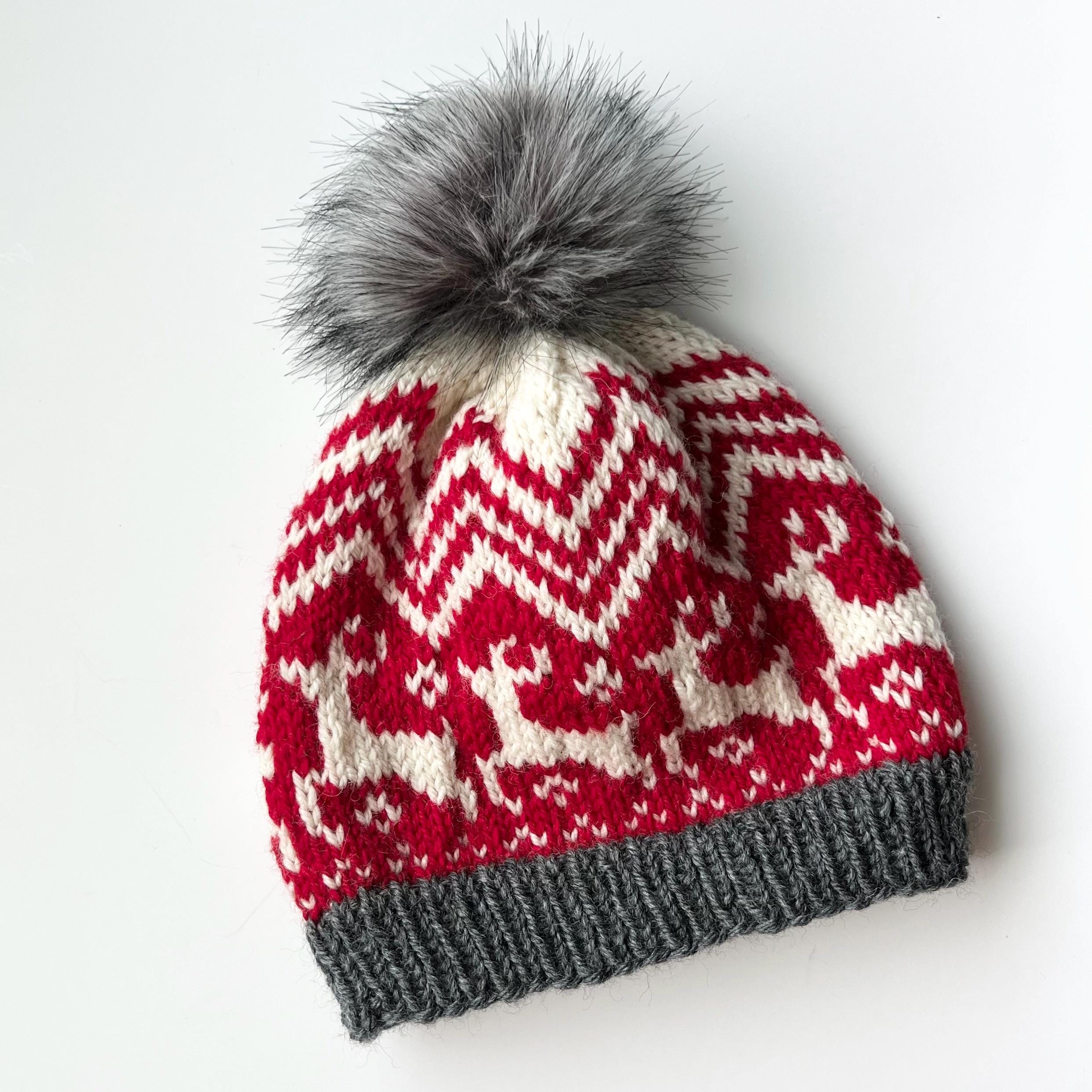 This warm winter hat was hand knit in 100% wool that is so incredibly soft and warm. It features a cute reindeer motif perfect for the holiday season.